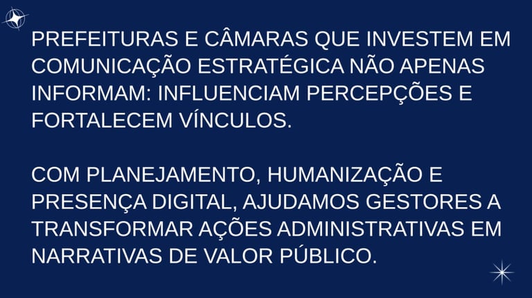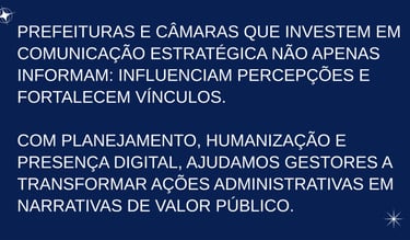 Nosso trabalho combina estratégia, design e tecnologia para fortalecer a imagem de instituições públicas, garantindo transparência, padronização visual e relacionamento direto com o cidadão.